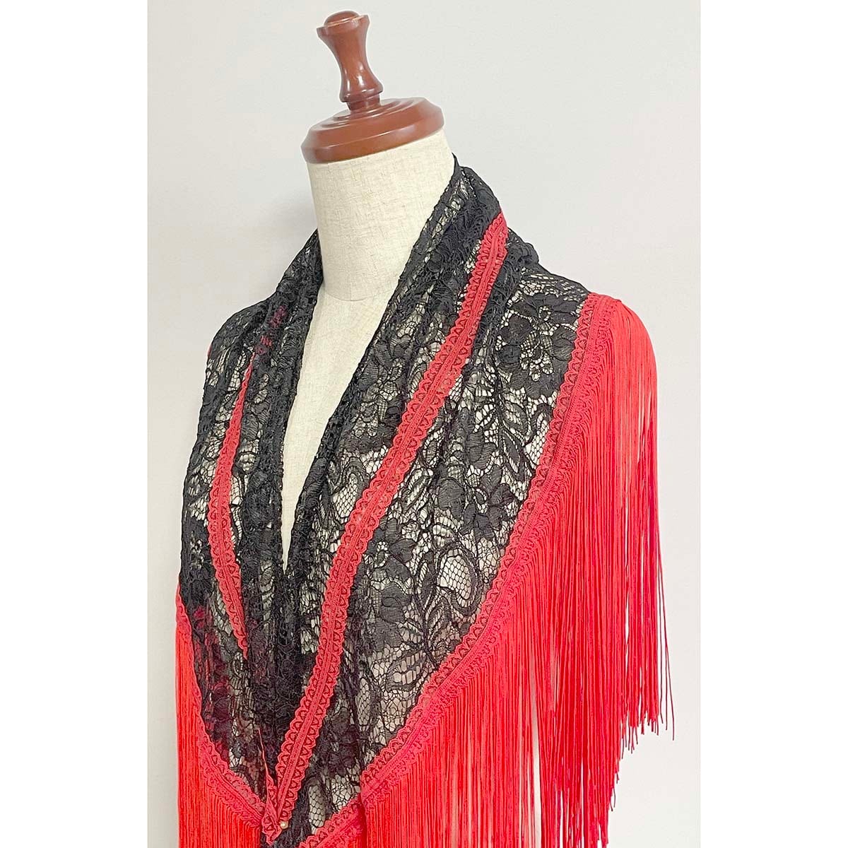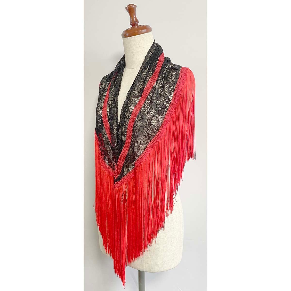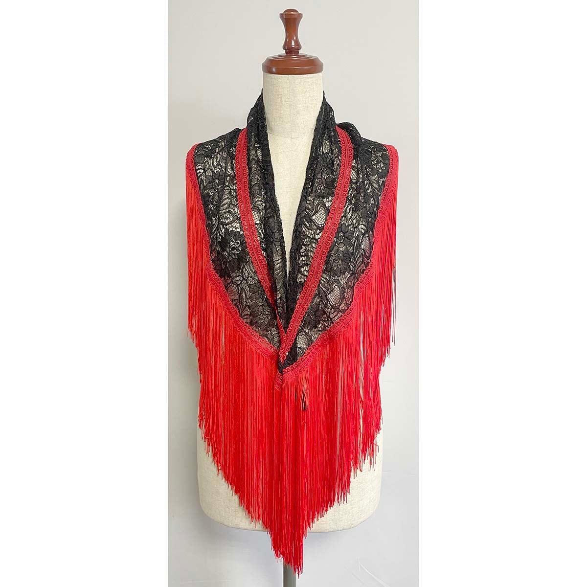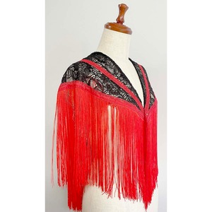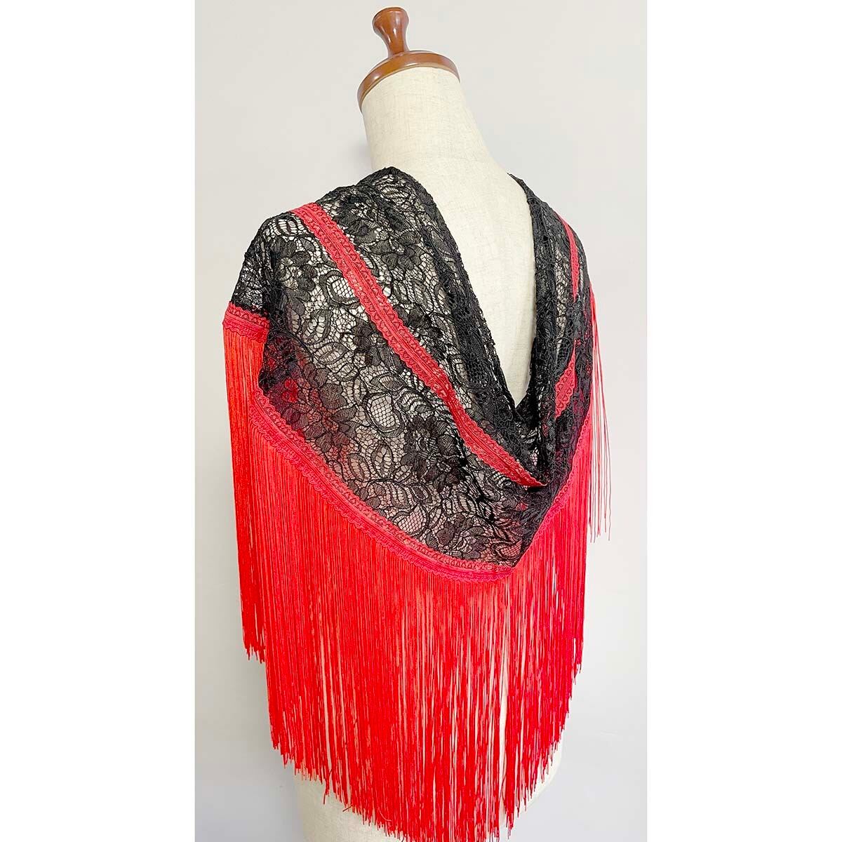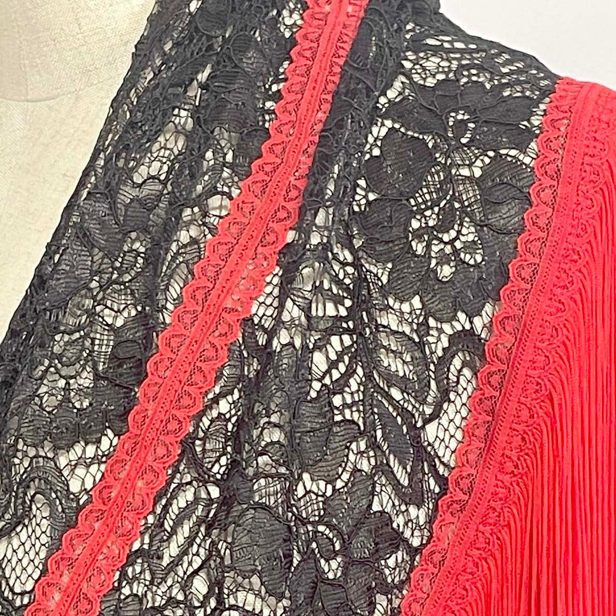 豪華な黒のコードレース生地と鮮やかな赤フリンジのシージョです。