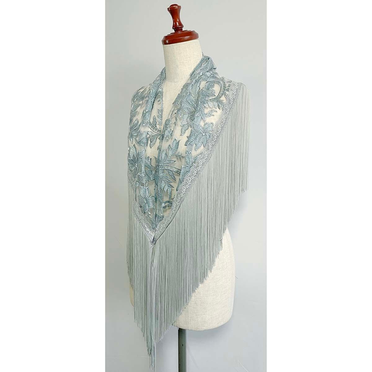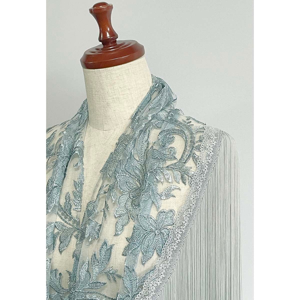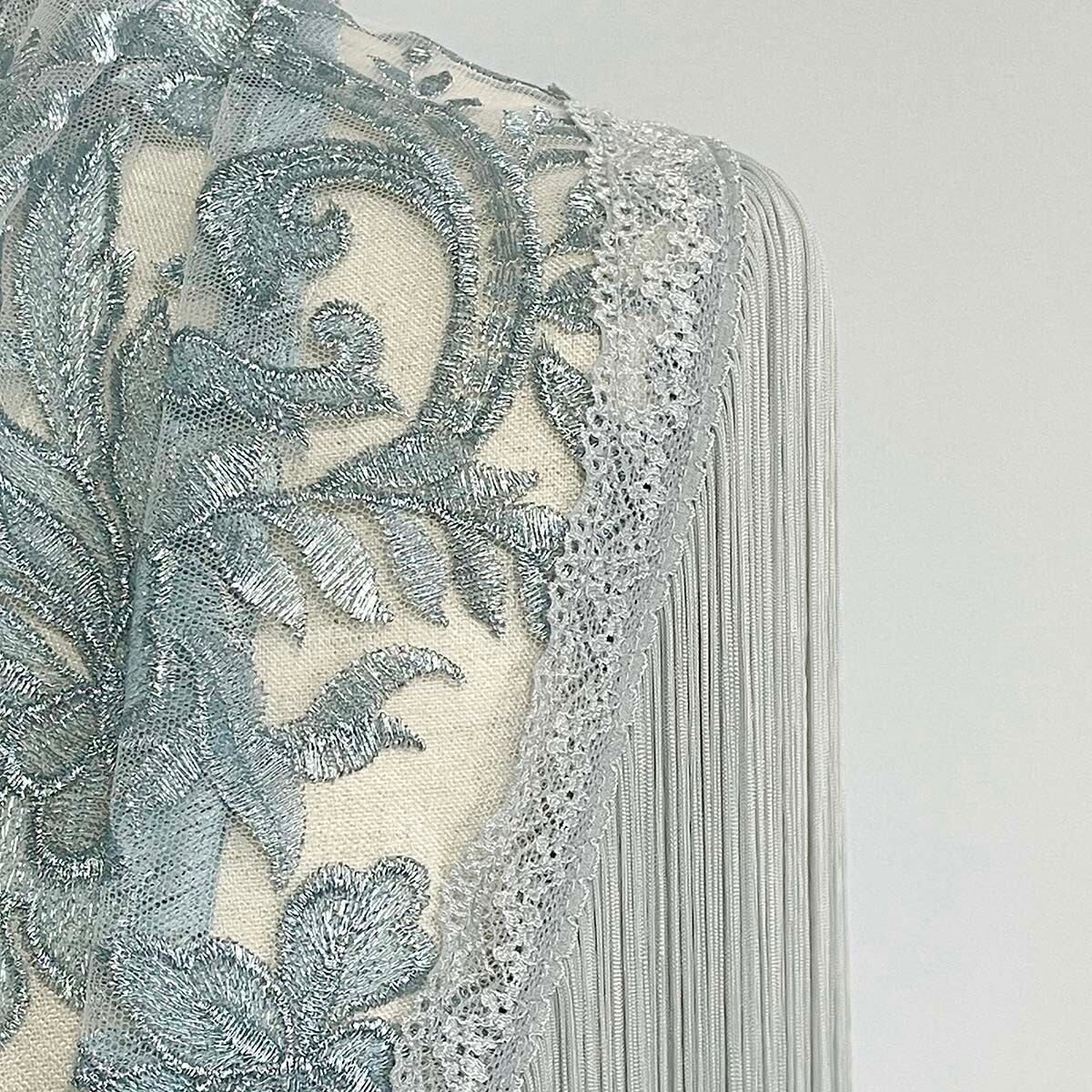 非常に豪華なスペイン製のライトブルーグレーの刺繍チュール生地のシージョです。