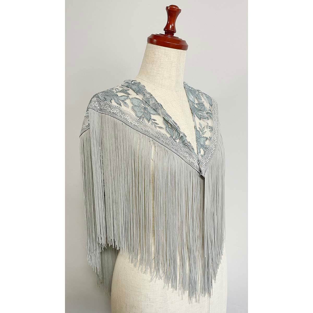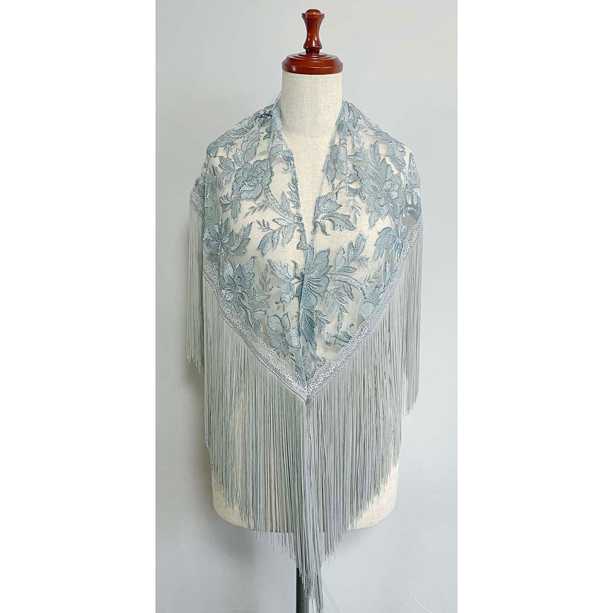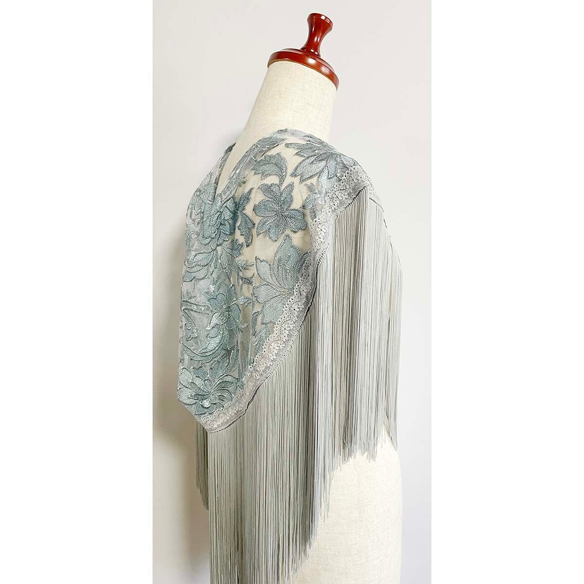 非常に豪華なスペイン製のライトブルーグレーの刺繍チュール生地のシージョです。